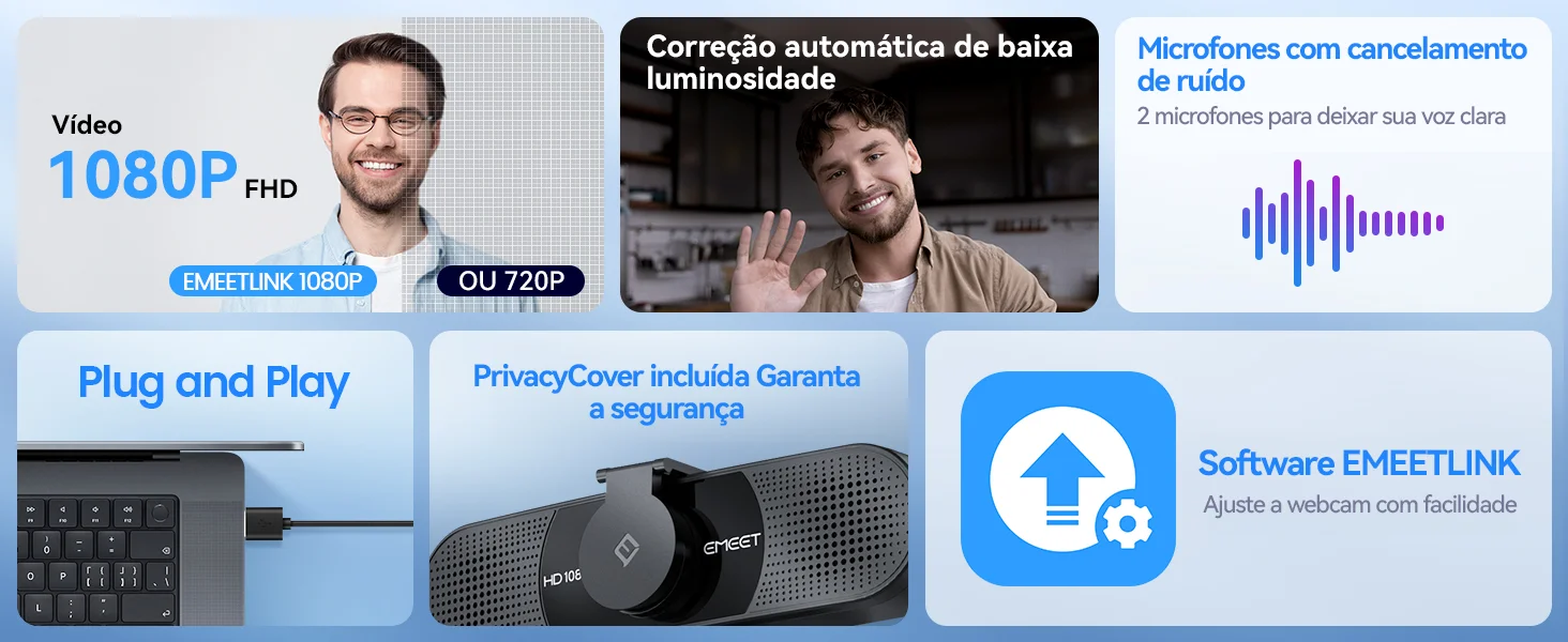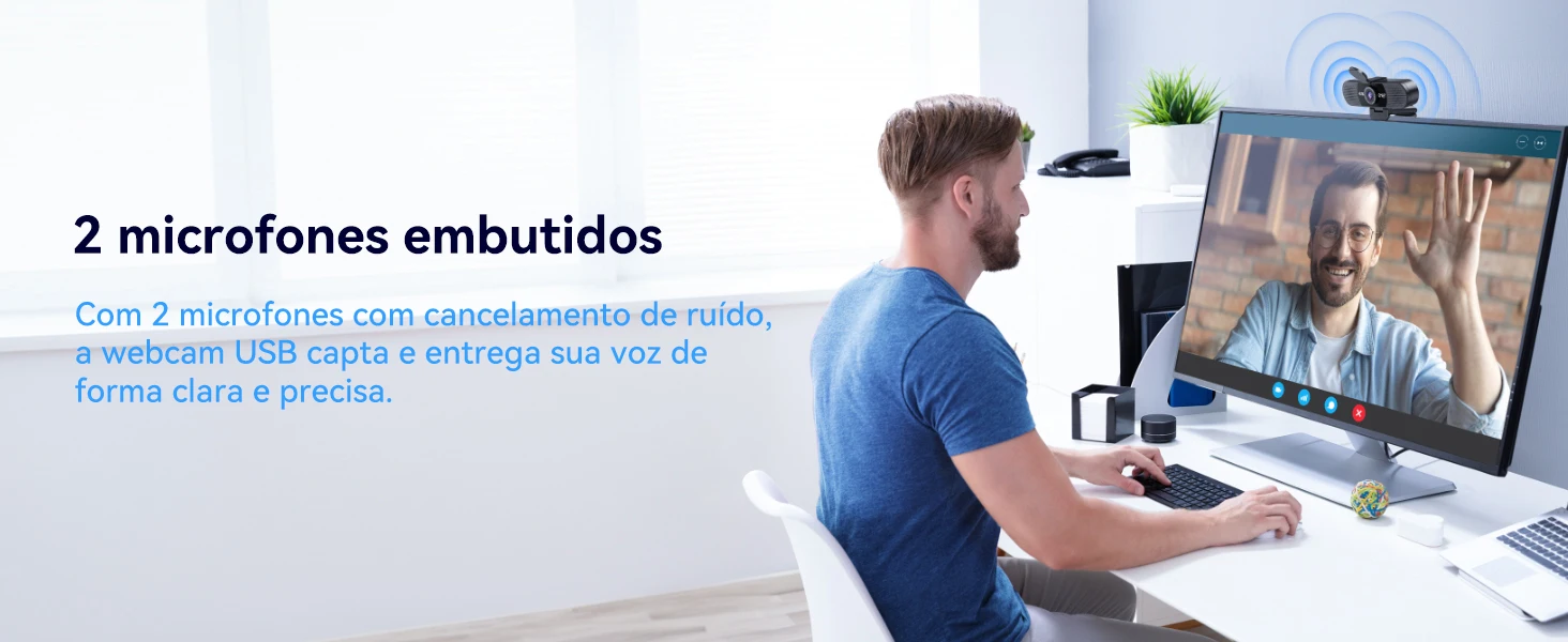 Com 2 microfones com cancelamento de ruído, a webcam USB capta e entrega sua voz de forma clara e precisa.
