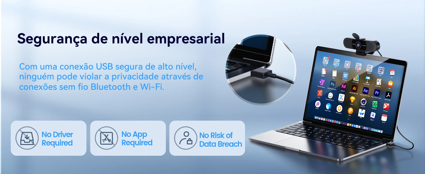 Com uma conexão USB segura de alto nível, ninguém pode violar a privacidade através de conexões sem fio Bluetooth e Wi-Fi.